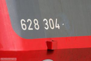 Beschriftung am Triebwagen 628 304, aufgenommen am 30. März 2009. Ursprünglich lautete die Prüfziffer dazu 8.