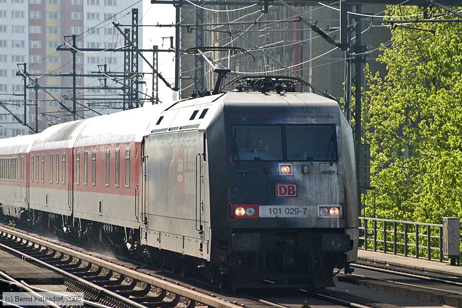 | Deutsche Bahn - 101029-7 Lok 101 029-7 mit einem Nachtzug beim Bahnhof Berlin Alexanderplatz, aufgenommen am 22. April 2005. Diese Lokomotive wurde im August 1997 abgenommen und im August 2022 zerlegt. Photo: Bernd Kittendorf (info@bernd-kittendorf.de) Homepage: www.bernd-kittendorf.de |