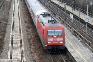 Lok 101 029-7 bei der Fahrt durch den Haltepunkt Mannheim Rangierbahnhof, aufgenommen am 02. Januar 2008. Gut zu erkennen ist die Holzkonstruktion, mit der die Bahnsteighöhe für den S-Bahnbetrieb vergrößert worden war.