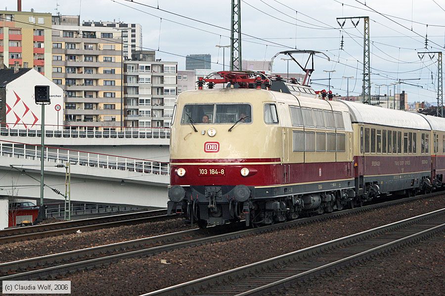 | Deutsche Bahn - 103184-8 Lok 103184-8 aus Richtung Mannheim kommend bei der Fahrt durch Ludwigshafen (Rhein) Hauptbahnhof auf Gleis 11, aufgenommen am 02. April 2006. Photo: Claudia Wolf (info@claudia-blondie-wolf.de) Homepage: www.claudia-blondie-wolf.de |