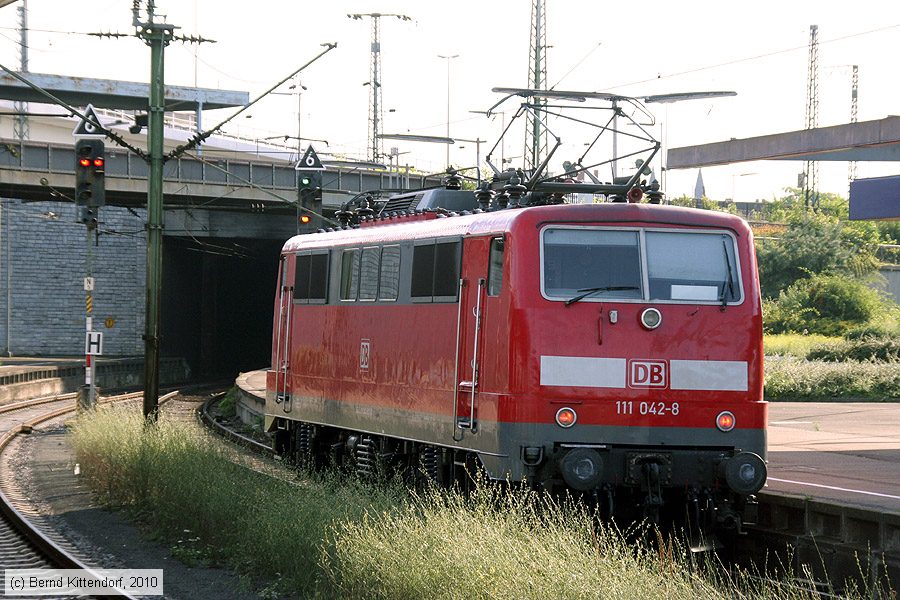 | Deutsche Bahn - 111042-8 Lok 111 042-8 bei der Fahrt durch Ludwigshafen (Rhein) Hauptbahnhof, aufgenommen am 19. August 2010. Photo: Bernd Kittendorf (info@bernd-kittendorf.de) Homepage: www.bernd-kittendorf.de |