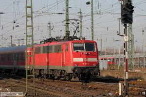Lok 111 115 mit einem Zug aus n-Wagen in Mainz-Bischofsheim, aufgenommen am 21. Juni 2013.