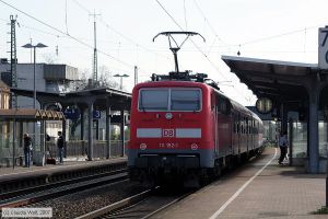 Lok 111 192-1 in Mannheim Friedrichsfeld, aufgenommen am 06. April 2007. Seit Dezember 2016 wird diese Station unter der Bezeichnung Neu-Edingen / Friedrichsfeld geführt.