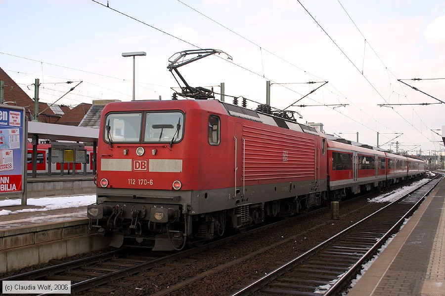 | Deutsche Bahn - 112170-6 Lok 112170-6 im Bahnhof Frankfurt (Main) Süd, aufgenommen am 06. März 2006 am Bahnsteig. Photo: Claudia Wolf (info@claudia-blondie-wolf.de) Homepage: www.claudia-blondie-wolf.de |