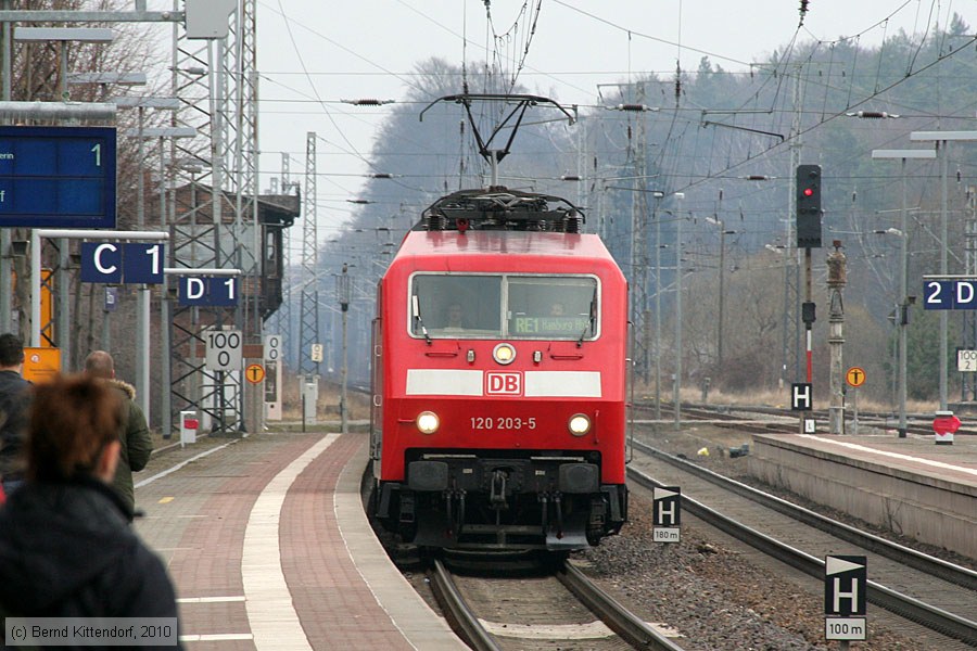 | Deutsche Bahn - 120203-5 Lok 120 203-5 mit einem Zug nach Hamburg Hauptbahnhof bei der Ankunft im Bahnhof Bützow auf Gleis 1, aufgenommen am 19. März 2010. Photo: Bernd Kittendorf (info@bernd-kittendorf.de) Homepage: www.bernd-kittendorf.de |