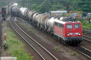 Güterzug mit Lok 140197-5 im Bahnhof Berlin Schönefeld Flughafen, aufgenommen am 19. Mai 2005.