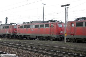 Lok 140195-9 mit einem Güterzug bei der Fahrt durch den Bahnhof Ludwigshafen Oggersheim, aufgenommen am 04. Februar 2005. Hersteller des Fahrzeugs waren Krauss-Maffei und die Siemens-Schuckert-Werke im Jahr 1960. Es wurde im Jahr 2008 ausgemustert und zerlegt.