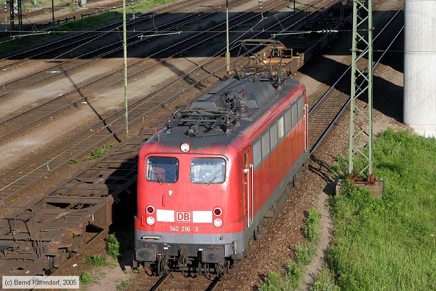 | Deutsche Bahn - 140216-3 Lok 140216-3 in Mannheim Rangierbahnhof, aufgenommen am 10. Mai 2005. Photo: Bernd Kittendorf (info@bernd-kittendorf.de) Homepage: www.bernd-kittendorf.de |