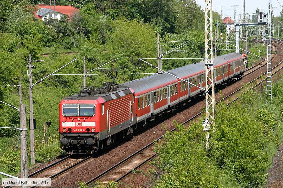 | Deutsche Bahn - 143204-6 Lok 143204-6 in Frankfurt (Oder), aufgenommen am 20. Mai 2005. Photo: Bernd Kittendorf (info@bernd-kittendorf.de) Homepage: www.bernd-kittendorf.de |