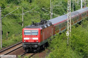 Lok 143360-6 im Bahnhof Berlin Schönefeld Flughafen, aufgenommen am 19. Mai 2005 mit einem Zug nach Potsdam Hauptbahnhof.