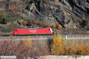 Lok 145005-5 bei der Fahrt rheinaufwärts, von der gegenüberliegenden Seite des Rheins in Oberwesel gesehen und aufgenommen am 04. November 2011.