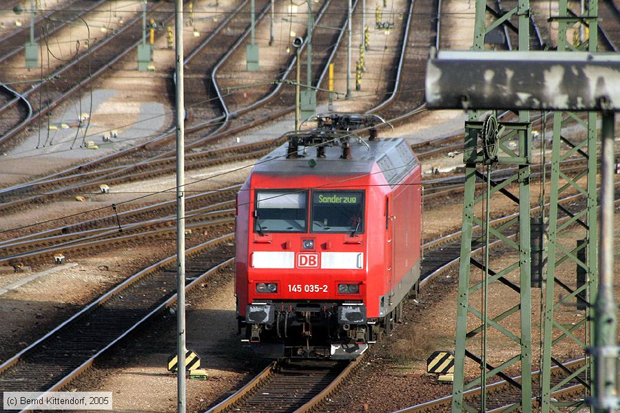 | Deutsche Bahn - 145035-2 Lok 145 035-2 (Baujahr 1999, mit Regio-Paket, daher die Anzeige Sonderzug oben im Fenster) in Mannheim Rangierbahnhof, aufgenommen am 21. März 2005. Photo: Bernd Kittendorf (info@bernd-kittendorf.de) Homepage: www.bernd-kittendorf.de |