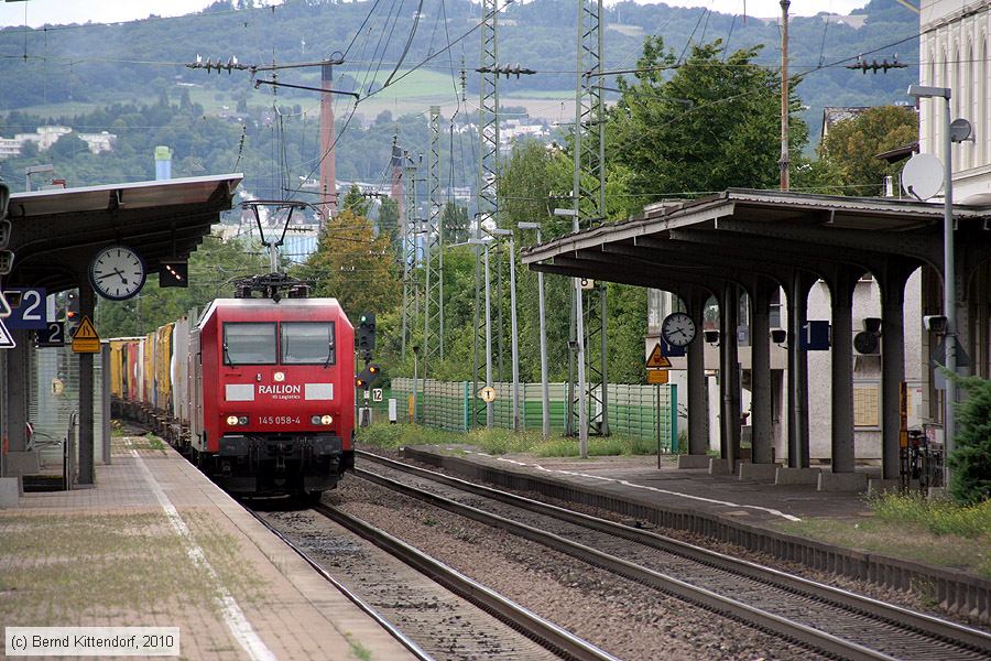 | Deutsche Bahn - 145058-4 Lok 145 058-4 mit einem Güterzug bei der Fahrt durch den Bahnhof Weißenthurm auf Gleis 2, aufgenommen am 19. August 2010. Photo: Bernd Kittendorf (info@bernd-kittendorf.de) Homepage: www.bernd-kittendorf.de |