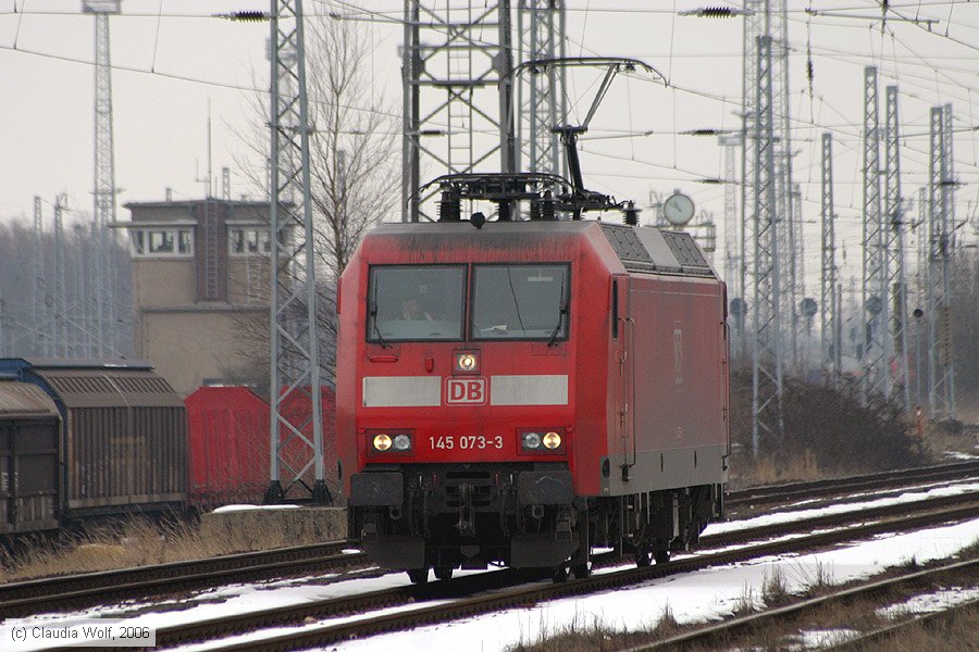 | Deutsche Bahn - 145073-3 Lok 145073-3 in Rostock Toitenwinkel, aufgenommen am 16. März 2006. Photo: Claudia Wolf (info@claudia-blondie-wolf.de) Homepage: www.claudia-blondie-wolf.de |