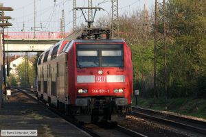 Lok 146 001-3 mit einem Doppelstock-Wendezug auf Linie RB44 nach Mannheim Friedrichsfeld bei der Abfahrt im Bahnhof Ludwigshafen Oggersheim auf Gleis 1, aufgenommen am 11. April 2005. Vorn am Zug befindet sich Doppelstock-Steuerwagen 50 80 80 35322-2 (Typ DABpbzfa762, links im Bild).