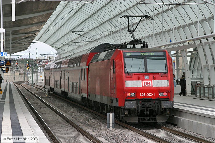 | Deutsche Bahn - 146002-1 Lok 146 002-1 auf der Fahrt nach Mainz beim Halt in Ludwigshafen (Rhein) Mitte auf Gleis 1, aufgenommen am 27. Dezember 2003. Photo: Bernd Kittendorf (info@bernd-kittendorf.de) Homepage: www.bernd-kittendorf.de |
