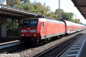 Lok 146007-0 auf Linie RE5 nach Emmerich bei der Fahrt durch den Bahnhof Weißenthurm auf Gleis 1, aufgenommen am 01. Oktober 2011.