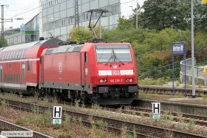 Lok 146202-7 in Stuttgart Hauptbahnhof auf Gleis 13, aufgenommen am 12. August 2010. Die Lok trägt seitlich die Werbung Baden-Württemberg bewegt was. Der Zug IRE 4231 nach Lindau Hauptbahnhof ist ein Doppelstock-Wendezug.