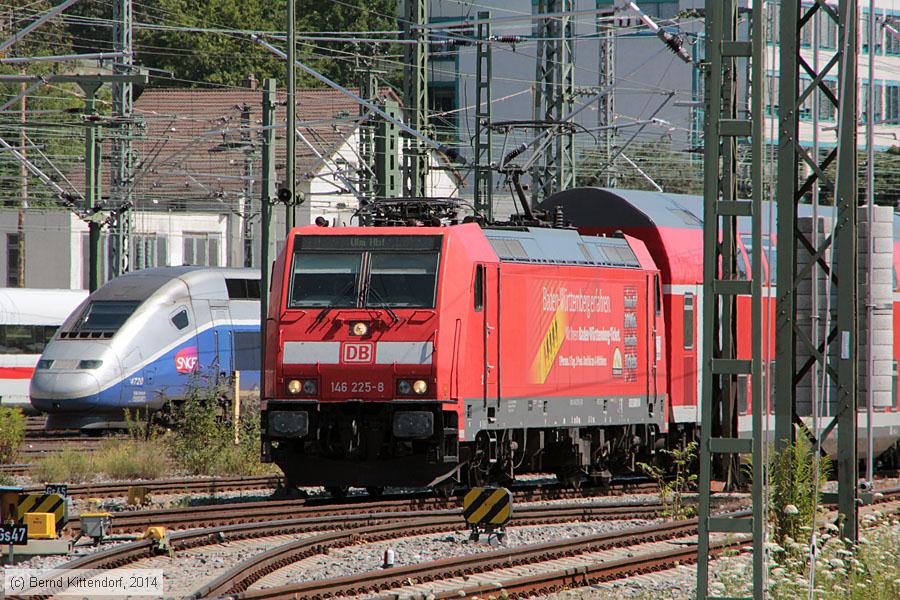| Deutsche Bahn - 146225-8 Lok 91 80 6146 225-8 D-DB in Stuttgart Hauptbahnhof, aufgenommen am 17. Juli 2014. Link im Hintergrund ist einer der beiden Triebköpfe des TGV-Sets 4720 zu sehen. Photo: Bernd Kittendorf (info@bernd-kittendorf.de) Homepage: www.bernd-kittendorf.de |