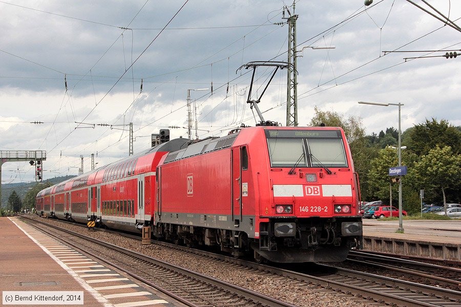 | Deutsche Bahn - 146228-2 Lok 146 228-2 mit einem RE nach Offenburg bei der Abfahrt im Bahnhof Denzlingen auf Gleis 1, aufgenommen am 12. August 2014. Vorn am Zug (links im Bild) ist Doppelstock-Steuerwagen 50 80 86 35066-9 D-DB (Typ DBpbzfa765). Photo: Bernd Kittendorf (info@bernd-kittendorf.de) Homepage: www.bernd-kittendorf.de |