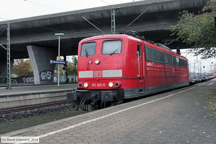 | Deutsche Bahn - 151001-5 Lok 151 001-5 bei der Fahrt durch den Bahnhof Hamburg-Harburg auf Gleis 5, aufgenommen am 15. Oktober 2014. Photo: Bernd Kittendorf (info@bernd-kittendorf.de) Homepage: www.bernd-kittendorf.de |