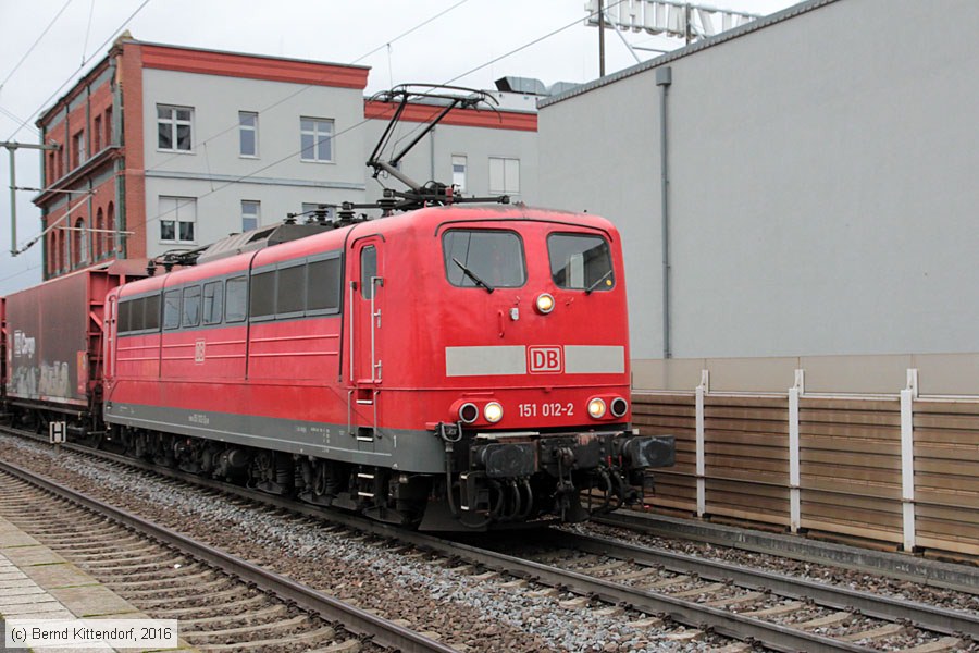 | Deutsche Bahn - 151012-2 Lok 151 012-2 (Hersteller Krupp und AEG, Baujahr 1973, verkehrsrot, mit Einholmstromabnehmer) in Ludwigshafen (Rhein) Mitte, aufgenommen am 15. Januar 2016. Sie wurde inzwischen von der DB verkauft, kam zu Railpool und wurde im Mai 2021 zerlegt. Photo: Bernd Kittendorf (info@bernd-kittendorf.de) Homepage: www.bernd-kittendorf.de |