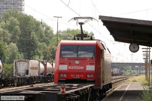 Lok 152091-5 mit einem einzelnen Wagen, aufgenommen am 23. Juni 2006 im Bahnhof Ludwigshafen Oggersheim auf Gleis 3.