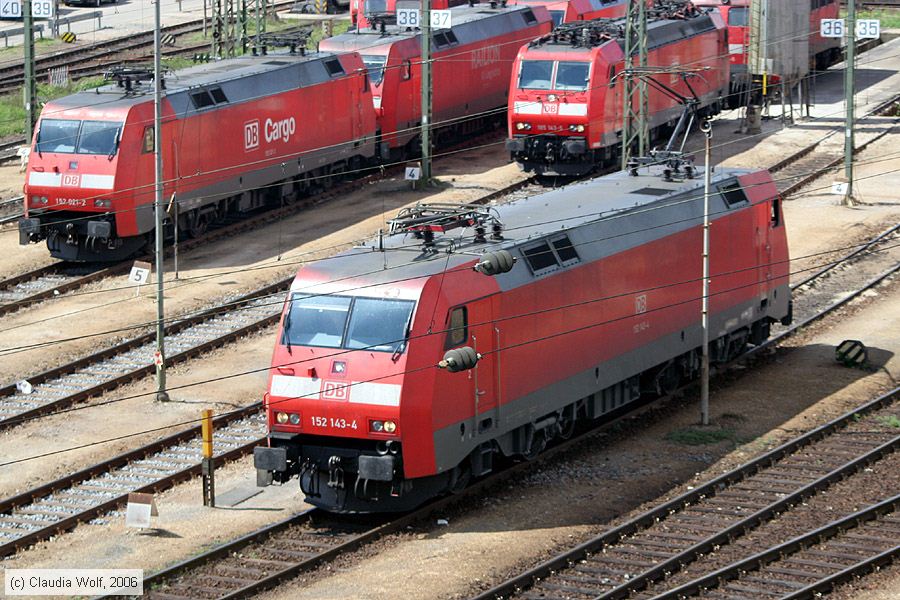 | Deutsche Bahn - 152143-4 Lok 152143-4 in Mannheim Rangierbahnhof, aufgenommen am 29. April 2006. Die Lok ist nur mit DB beschriftet. Gut zu erkennen sind die im Vergleich zu anderen Baureihen sehr aufgeräumten Dachaufbauten. Photo: Claudia Wolf (info@claudia-blondie-wolf.de) Homepage: www.claudia-blondie-wolf.de |