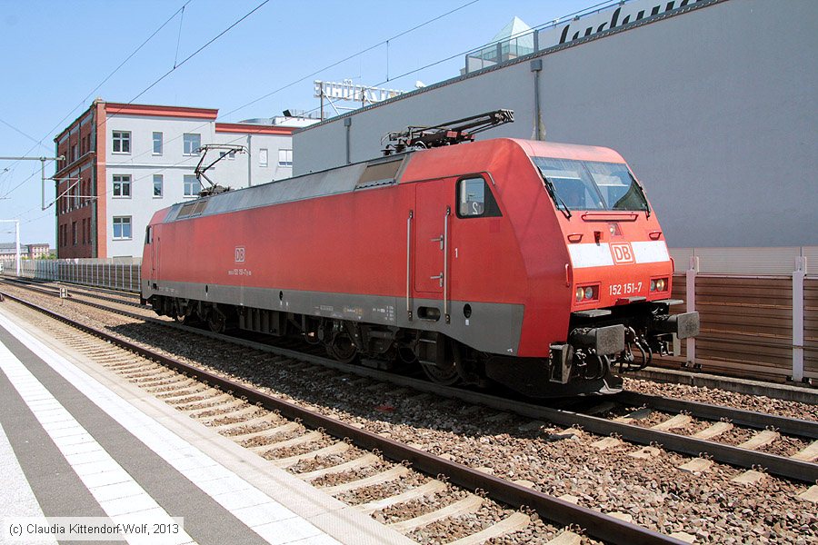 | Deutsche Bahn - 152151-7 Lok 91 80 6152 151-7 D-DB bei der Fahrt durch Ludwigshafen (Rhein) Mitte, aufgenommen am 08. Juli 2013. Diese Lokomotive vom Hersteller Krauss-Maffei ist seit Januar 2001 im Bestand der Deutschen Bahn. Photo: Claudia Kittendorf-Wolf (info@claudia-blondie-wolf.de) Homepage: www.claudia-blondie-wolf.de |