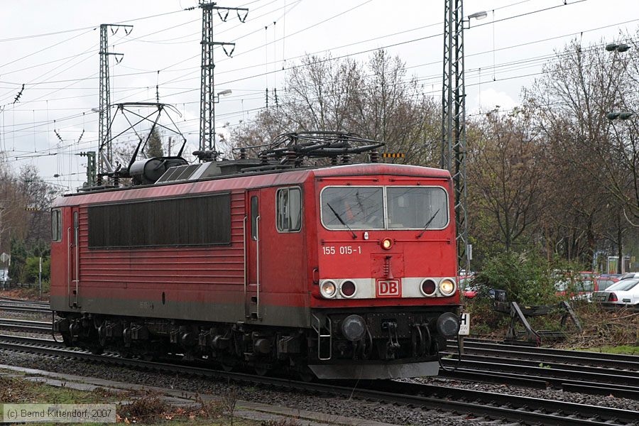 | Deutsche Bahn - 155015-1 Lok 155 015-1 bei der Fahrt durch Mannheim Hauptbahnhof, aufgenommen am 22. März 2007. Diese Lokomotive wurde 1977 gebaut, im März 1977 von der Deutschen Reichsbahn abgenommen und zunächst als 250 015-5 bezeichnet. Sie wurde 2017 mit vielen anderen an Railpool verkauft und im Mai 2021 zerlegt. Photo: Bernd Kittendorf (info@bernd-kittendorf.de) Homepage: www.bernd-kittendorf.de |