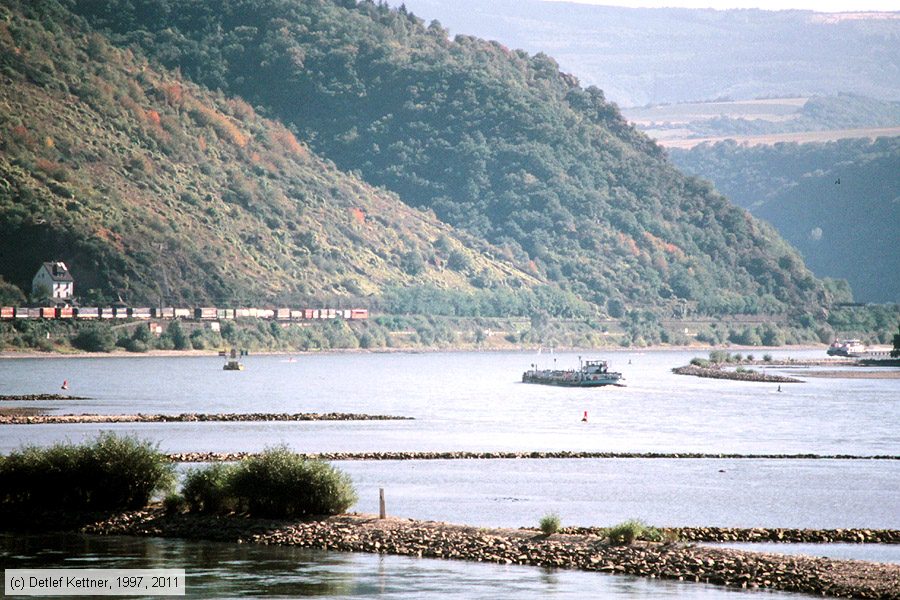 | Deutsche Bahn - 155093-8 Lok 155093-8 mit einem Güterzug bei der Fahrt rheinaufwärts bei Kaub , aufgenommen am 26. September 1997. Photo: Detlef Kettner, Scan: Bernd Kittendorf (info@bernd-kittendorf.de) Homepage: www.bkcw-bahnbilder.de |