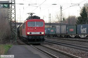 Lok 155234-8 mit einem Güterzug bei der Fahrt durch den Bahnhof Ludwigshafen Oggersheim auf Gleis 1, aufgenommen am 05. April 2006.