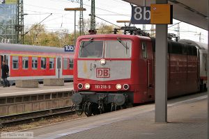 Lok 181 218-9 bei der Abfahrt in Darmstadt Hauptbahnhof, aufgenommen am 07. Mai 2006.