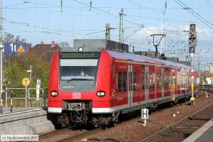 Triebwagen 425 207-8 auf dem Weg nach Osterburken bei der Abfahrt in Mannheim Hauptbahnhof, aufgenommen am 02. April 2012. Dieser Triebzug trägt den Namen Ludwigshafen am Rhein.