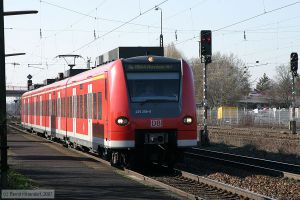 Triebwagen 425 259-9 auf dem Weg nach Mainz Hauptbahnhof im Bahnhof Ludwigshafen Oggersheim auf Gleis 2, aufgenommen am 12. Juli 2005. Die Abnahme dieses vierteiligen Triebzugs erfolgte im Dezember 2004. An beiden Enden des vierteiligen Triebzugs gibt es einen Bereich mit Sitzplätzen 1. Klasse, erkennbar am gelben Streifen oberhalb der entsprechenden Fenster des Fahrgastraums.