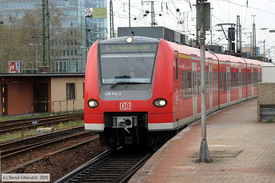 | Deutsche Bahn - S-Bahn Rhein Neckar - 425714-3 Triebwagen 425714-3 auf Linie S1 nach Heidelberg Hauptbahnhof in Mannheim Hauptbahnhof, aufgenommen am 16. April 2005. Photo: Bernd Kittendorf (info@bernd-kittendorf.de) Homepage: www.bernd-kittendorf.de |