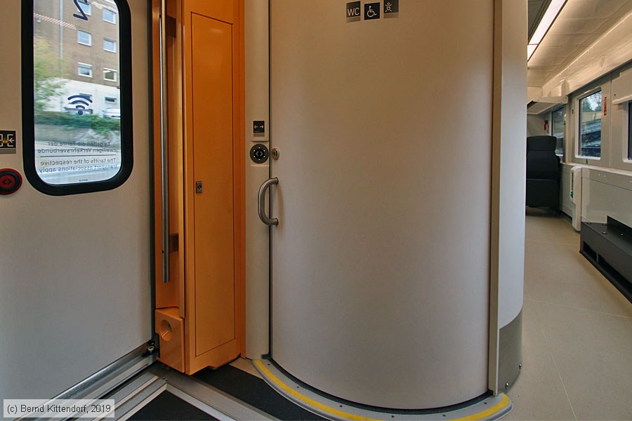| Deutsche Bahn - 1441 501 - Innenansicht Universaltoilette im Mittelteil 94 80 1441 501-2 D-DB, aufgenommen am 15. Oktober 2019. Der Zugang befindet sich direkt am Einstiegsbereich. Links neben der Tür gibt es einen beleuchteten Taster für die Türöffnung, an der Tür befindet sich ein massiver Griff. Zum Erreichen der Rollstuhlplätze muß man durch den Gang rechts vom Toiletten-Modul gehen (oder rollen). Photo: Bernd Kittendorf (info@bernd-kittendorf.de) Homepage: www.bernd-kittendorf.de |