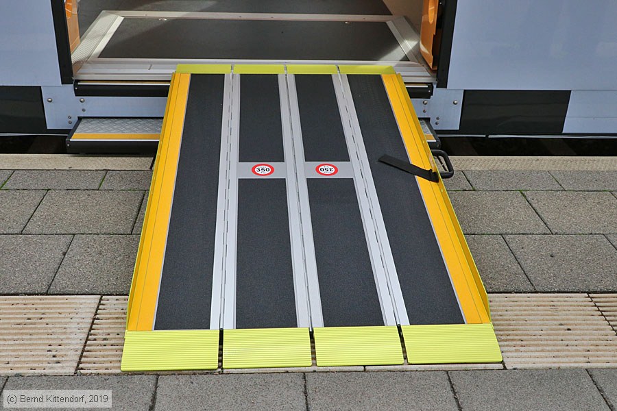 | Deutsche Bahn - 1441 501 Faltrampe als Einstiegshilfe für Rollstühle an der Fahrgasttür des Mittelteils 94 80 1441 501-2 D-DB, aufgenommen in Homburg (Saar) Hauptbahnhof am Bahnsteig für Gleis 7 am 15. Oktober 2019. Die Bahnsteighöhe wird für Gleis 7 in diesem Bereich mit 55 cm angegeben. Der Triebzug ist für Bahnsteige mit 76 cm Höhe gebaut worden. Ausgefahren ist der untere von zwei Schiebetritten, dessen Auftrittsfläche etwas höher liegt, als die Bahnsteigoberfläche. Die Rampe ist für bis zu 350 kg vorgesehen und an den Seiten gelb markiert. Sie besteht aus vier Streifen und hat seitlich Kanten. Photo: Bernd Kittendorf (info@bernd-kittendorf.de) Homepage: www.bernd-kittendorf.de |