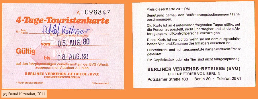 Berlin - 4-Tage-Touristenkarte Fahrkarte der BVG (Berliner Verkehrs-Betriebe), ausgegeben zum Preis von 20,00 DM. Die Rückseite ist rechts dargestellt. Die Entwertung erfolgte für die Zeit ab dem 05. August 1980. Abmessungen: 105 mm x 74 mm Scan: Bernd Kittendorf (info@bernd-kittendorf.de), Fahrkarte aus der Sammlung von Detlef W. Kettner. Homepage: www.bernd-kittendorf.de |