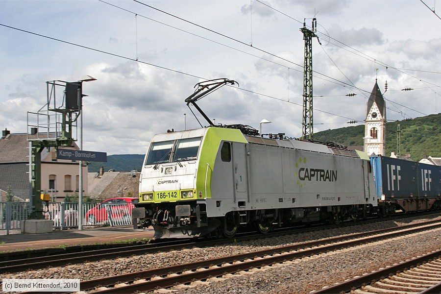 | CapTrain - 186 142 Lok 91 80 6186 142-6 D-ITL mit einem Güterzug bei der Fahrt durch den Bahnhof Kamp Bornhofen, aufgenommen am 19. August 2010. Photo: Bernd Kittendorf (info@bernd-kittendorf.de) Homepage: www.bernd-kittendorf.de |