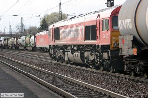 Lok DE 672 mit einem Güterzug bei der Fahrt durch den Bahnhof Ludwigshafen Oggersheim auf Gleis 2, aufgenommen am 11. April 2006.