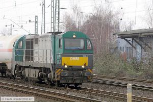 Lok DH 58 mit einem Güterzug bei der Fahrt durch Krefeld Linn, aufgenommen am 15. Februar 2011.