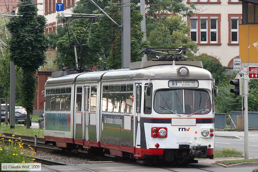 | OEG - 82 Triebwagen 82 auf Linie 5 nach Mannheim Käfertal in Mannheim bei der Abfahrt von der Haltestelle Universitätsklinikum, aufgenommen am 22. Juni 2009. Photo: Claudia Wolf (info@claudia-blondie-wolf.de) Homepage: www.claudia-blondie-wolf.de |