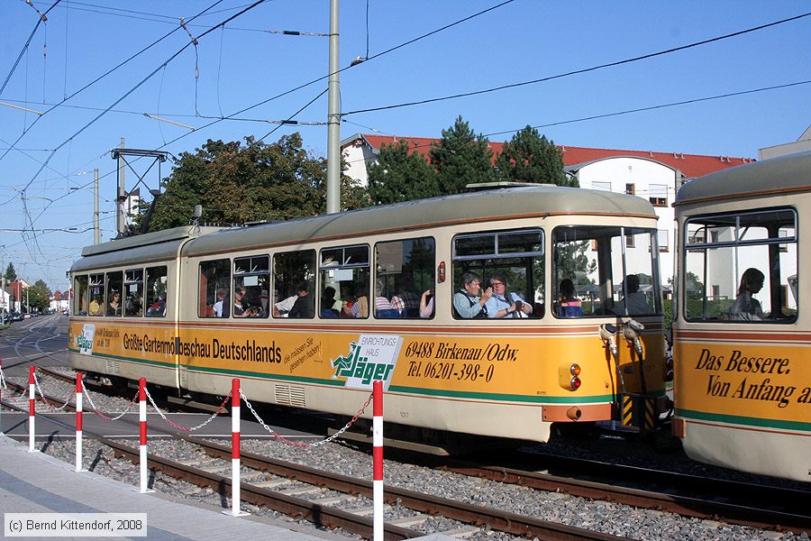 | Rhein-Haardtbahn - 1017 Triebwagen 1017 auf Linie 14 in Ludwigshafen Oggersheim, aufgenommen am 09. September 2008. Photo: Bernd Kittendorf (info@bernd-kittendorf.de) Homepage: www.bernd-kittendorf.de |