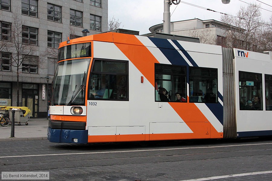 | Rhein-Haardtbahn - 1032 Triebwagen 1032 auf Linie 1 nach Schönau bei der Haltestelle Mannheim Hauptbahnhof, aufgenommen am 25. Januar 2014. Photo: Bernd Kittendorf (info@bernd-kittendorf.de) Homepage: www.bernd-kittendorf.de |