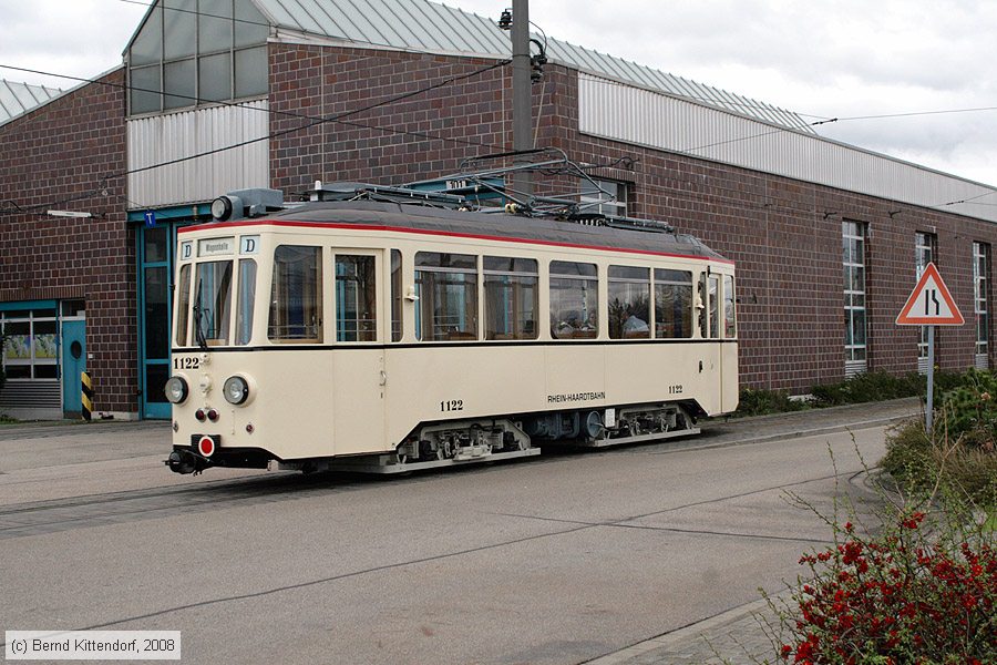 | Rhein-Haardtbahn - 1122 Triebwagen 1122 bei der Werkstatt-Halle. Das Fahrzeug verfügte zunächst über 30 Sitzplätze auf Längs- und Querbänken und 20 Stehplätze. Später wurde die Zahl der Stehplätze auf 37 festgelegt. Diese Aufnahme ist auf dem Gelände des Betriebshofs in Ludwigshafen Rheingönheim während der Veranstaltung DÜWAG Fotoparade der Interessengemeinschaft Nahverkehr Rhein-Neckar e.V. (IGN) am 16. März 2008 entstanden. Photo: Bernd Kittendorf (info@bernd-kittendorf.de) Homepage: www.bernd-kittendorf.de |
