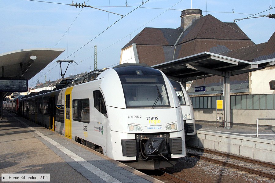 | Transregio - 460005-2 Triebwagen 460005-2 in Koblenz Hauptbahnhof auf Gleis 2, aufgenommen am 10. Februar 2011. Photo: Bernd Kittendorf (info@bernd-kittendorf.de) Homepage: www.bernd-kittendorf.de |