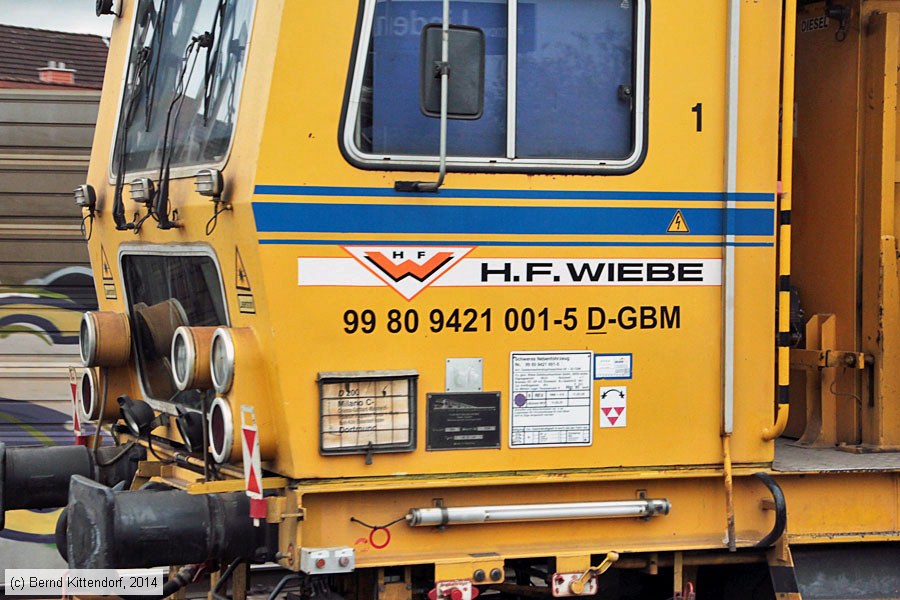 | Wiebe - 99809421001-5 Beschriftungen an der Gleisstopfmaschine 99 80 9421 001-5 D-GBM, aufgenommen am 02. September 2014. Photo: Bernd Kittendorf (info@bernd-kittendorf.de) Homepage: www.bernd-kittendorf.de |