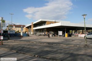 Busbahnhof auf dem Vorplatz mit dem Bahnhofsgebäude im Hintergrund, aufgenommen am 04. April 2011.