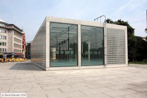 Zugangsgebäude des Haltepunkts Leipzig Wilhelm-Leuschner-Platz, aufgenommen am 28. Juli 2014. Dies ist eine der Stationen am City-Tunnel Leipzig. Sie wurde am 14. Dezember 2013 eröffnet.
